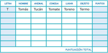 SCATTERGORIES: También llamado 'stop', 'tutti frutti' o 'alto el lápiz'. Se dibujan diferentes columnas en una hoja, siempre comenzando con 'letra' y terminando con 'puntuación', y se escriben categorías como: nombre, ciudad, comida, bebida, ropa, animal, música... Después, alguien dice una letra o fonema y se deben completar las categorías con una palabra de ese campo que empiece por dicha letra o fonema. El primero que las complete dice ¡stop! Y los demás tienen que parar, o se puede poner un cronómetro para terminar cada partida. Después se cuentan los puntos: 10 por cada palabra bien, 5 por cada palabra bien que alguien haya puesto igual (repetida) y 0 si no se contestó o está mal. Luego se continúa con otras letras y gana quién más puntos obtenga al final.
